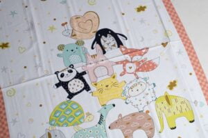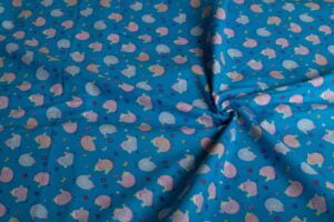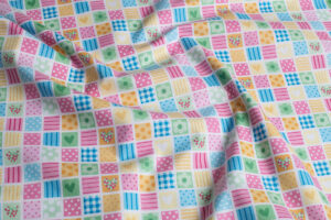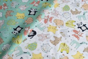 Tejido adorablemente diseñado, ideal para productos destinados a bebés y niños pequeños. Este material presenta estampados de tiernos animales y objetos suaves, como ositos de peluche, conejitos, y corazones, en colores pastel y tonos delicados.