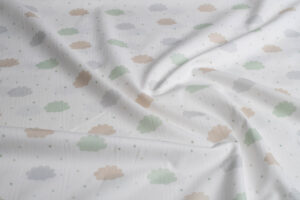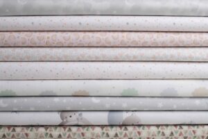 Preciosa colección de telas especiales para bebé. Para decorar su habitación en telas suaves, con dibujos sutiles y colores neutros grises, beig..