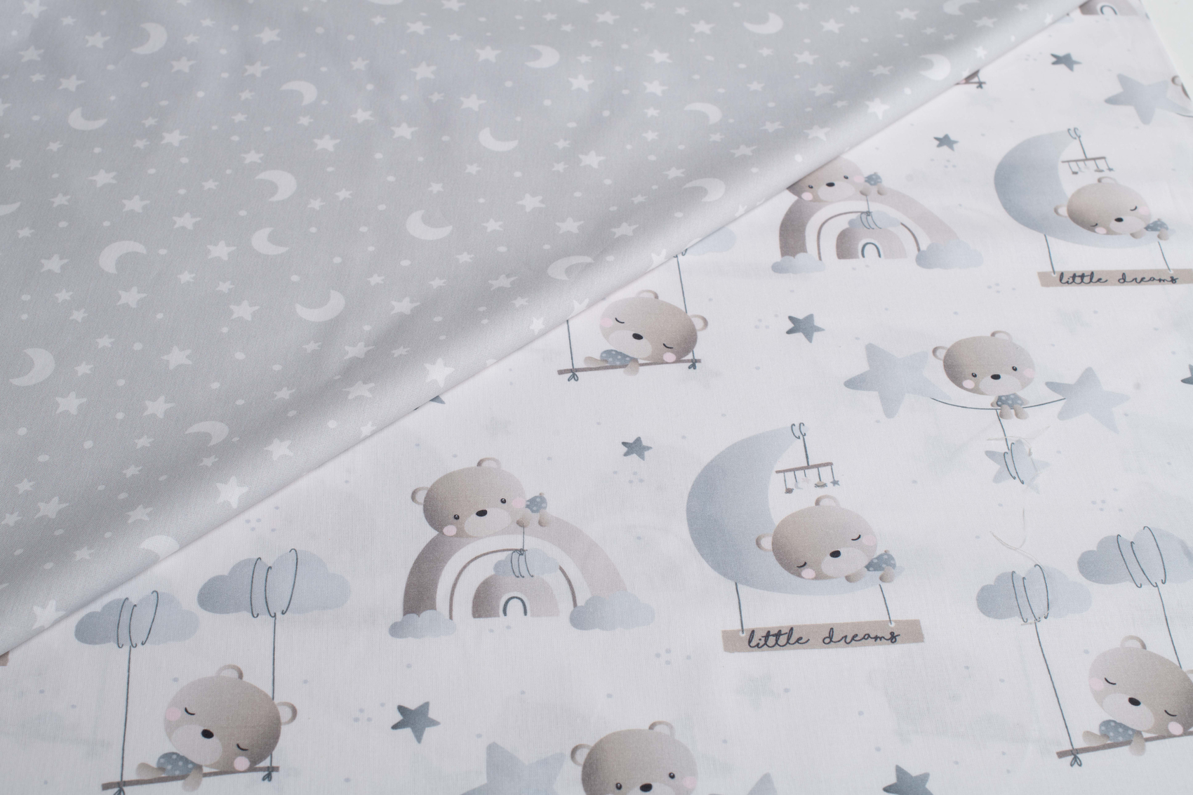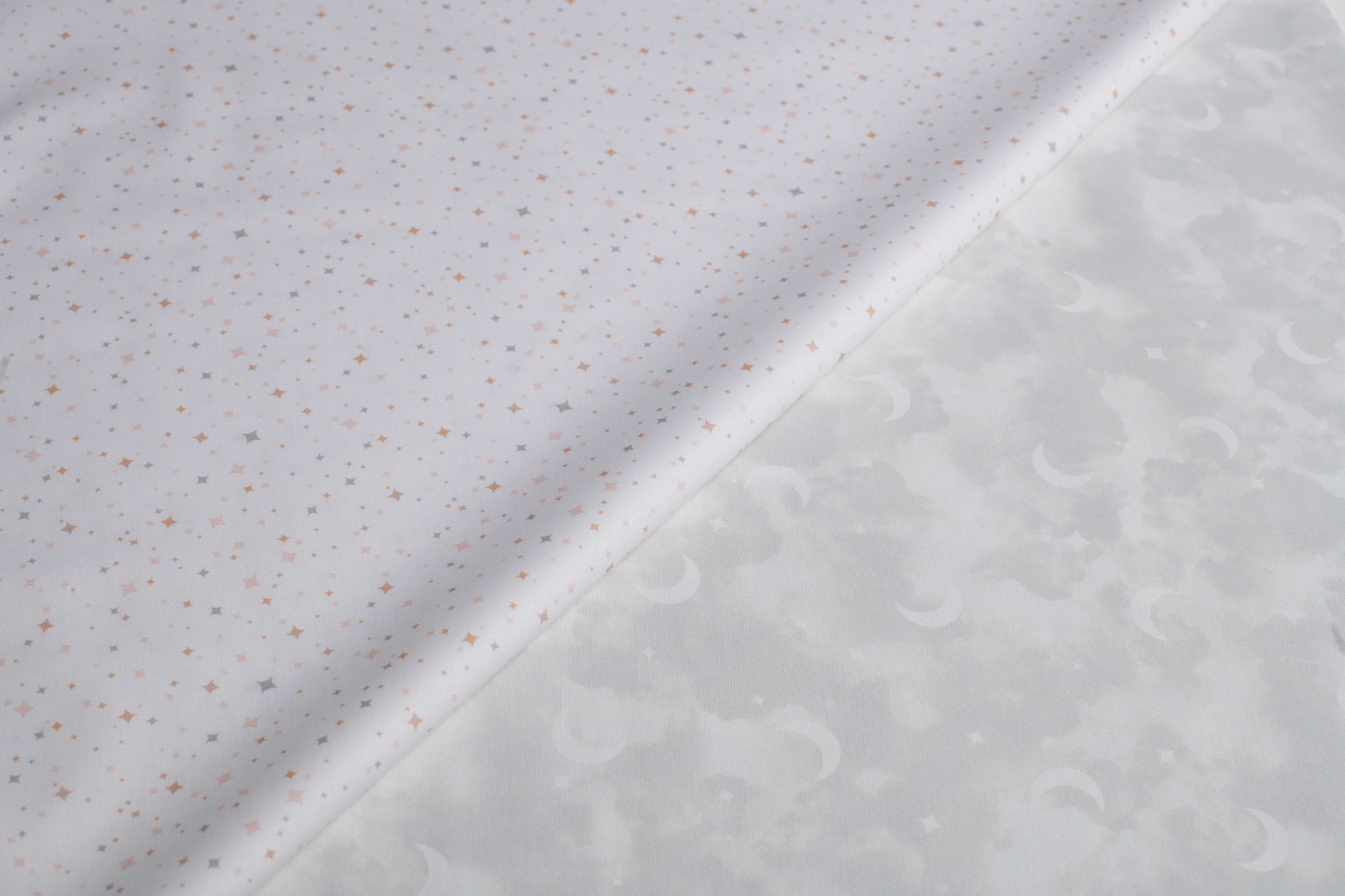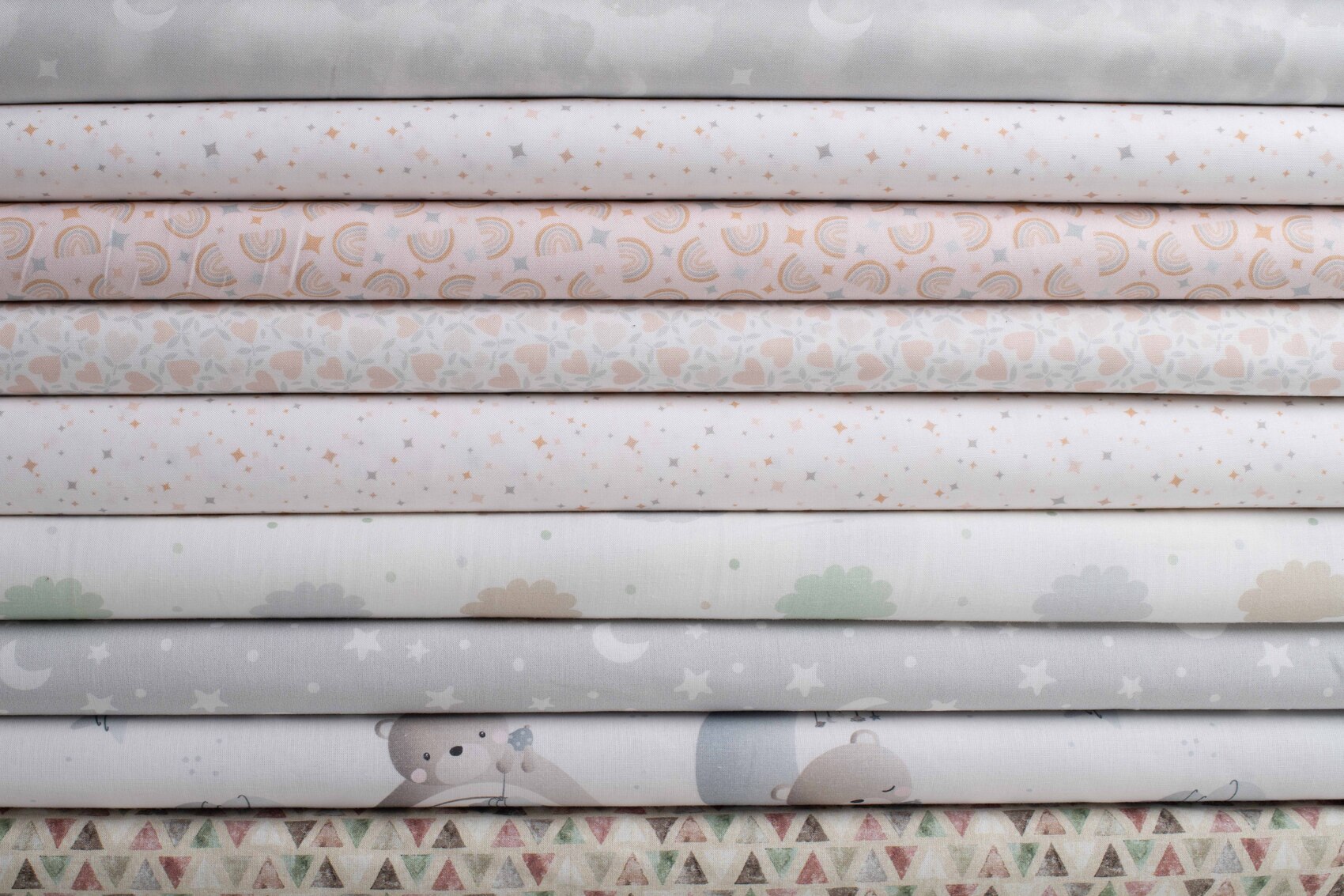Preciosa colección de telas especiales para bebé. Para decorar su habitación en telas suaves, con dibujos sutiles y colores neutros grises, beig..